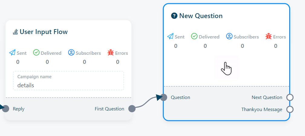 3. After saving the `User Input Flow`, a `New Question component will automatically appear in the flow. Alternatively, you can drag the socket named `First question` and place it in your bot flow to reveal the `New Question` component.